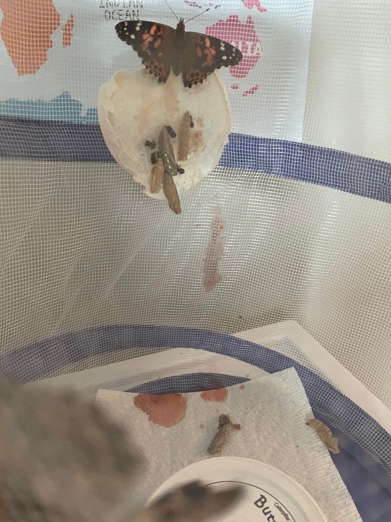 When the first one broke out from its chrysalis, we didn’t see it happen. Warren noticed it, about 15 minutes after we had checked last. It was clinging to the webbed side of the holding container and its wings were curled a bit, not moving. It takes some time for the wings to get blood flowing into them to unfurl and harden so that they can be flapped. The butterflies stay still for a good while, over an hour, as their blood flows and their bodies get used to their new reality. And then, the first flutter of their wings – open, shut, open, shut, open. That must feel like the greatest stretch of all time.
